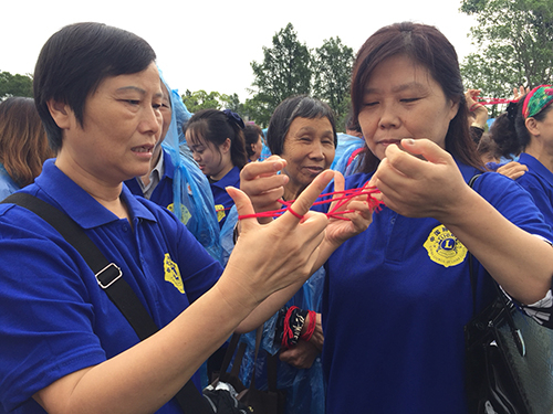 上午在活动现场,来自打浦桥、南码头、康桥、花木等街道社区的600多位中老年人,在公益慈善组织狮子联会志愿者的带领下,分成32支队伍,两两一组。在主持人一声号令下,大家整齐划一,开始翻起了红色花绳。两人合作用一根绳子结成绳套,一人以手指编成一种花样,另一人用手指接过来,翻成另一种花样,相互交替编翻,直到一方不能再编翻下去为止。游戏最大的乐趣在于翻出新花样,展现自己的聪明才智。 ?