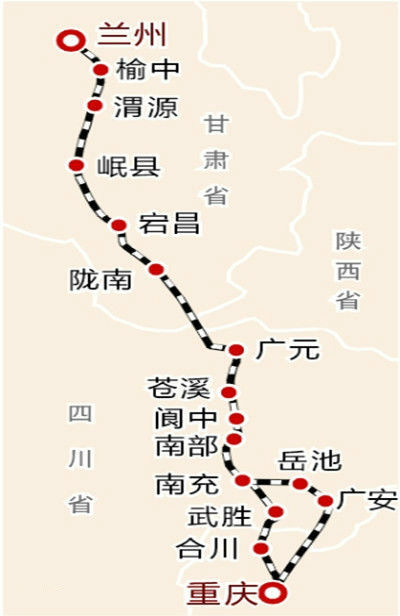 兰渝铁路全线将于9月29日开行首列直通旅客列车——重庆至兰州的K4515次旅客列车。它的开行,意味着兰渝铁路全线投入运营。根据12306网站的出行数据,K4515次列车重庆火车站的始发时间为8点38分,沿途停靠武胜、南充北、阆中、苍溪、广元、陇南、岷县、漳县、渭源,当天22点05分到达兰州,全程运行时间13小时27分。全程硬座票价115元,硬卧200元,软卧312元。