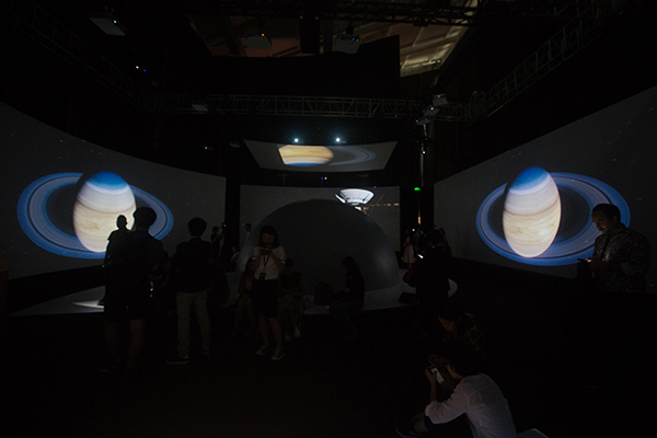 游客在观看360 °穿越太阳系的全景影像。