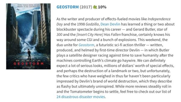 《全球风暴》上周在北美上映,票房输给了《黑疯婆子的万圣节2》,这引起了我的兴趣。