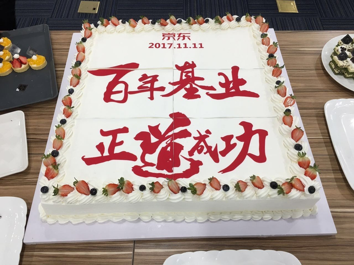 (巨大的奶油蛋糕上面写着“百年基业,正道成功”)