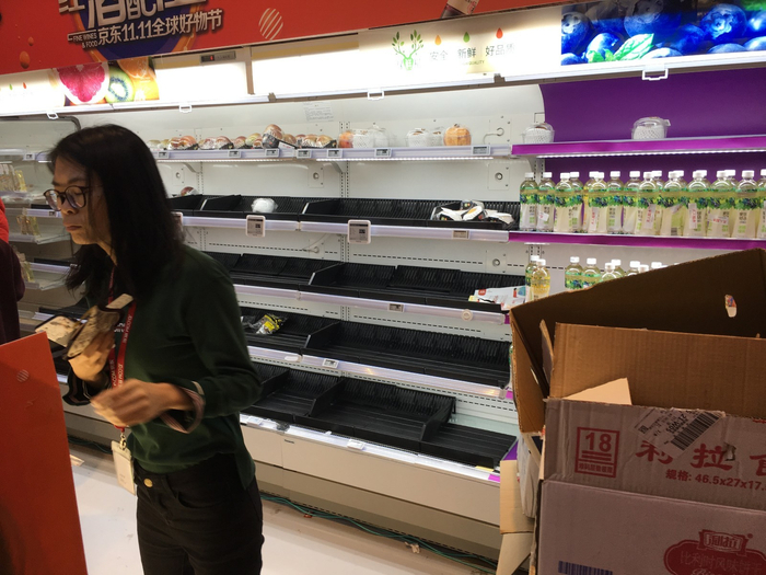 (京东无人超市的货架上常用日化产品几乎被抢购一空)