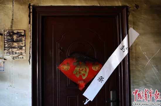 ????11月26日,北京市大兴区西红门镇新建二村聚福缘公寓“11·18”火灾现场,公寓二楼贴上封条的房间,门上的“福”字被燎掉了一半。
