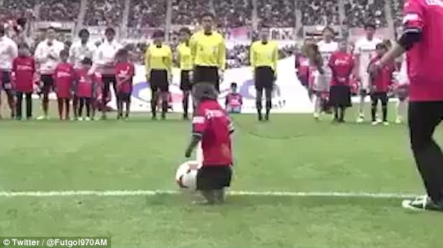 在大阪樱花队对阵神户胜利船队的J1联赛中,一只身穿樱花队队服的猴子被牵着带入场。现场视频中,工作人员用手拉着缠绕猴子在颈部的锁链,引导猴子用后肢来回踢球,几秒钟后,猴子捡起球走向裁判,并把球交给他。