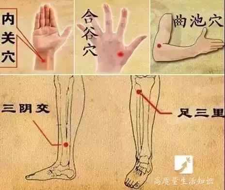 取足三里、三阴交、曲池、合谷、内关五个穴位,每个穴位用大拇指按揉,每个穴位按摩一分钟,两侧都要按到。