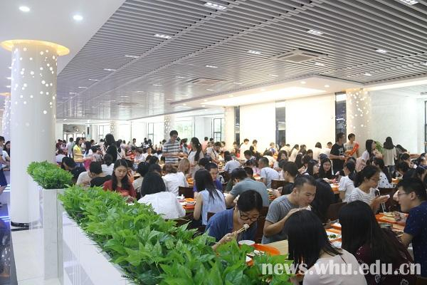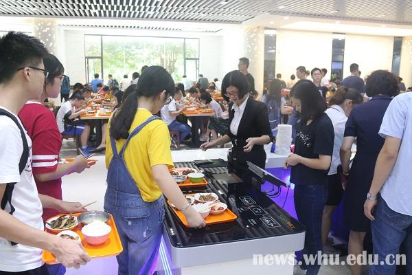 经典的奶咖色桌椅,光彩透亮的落地窗,时尚的高脚凳餐吧,绿草装饰的隔离带,美味丰富的菜品,自助选餐和智能餐盘结算……这不是哪家时尚餐厅,而是有着悠久历史的武大梅园食堂。