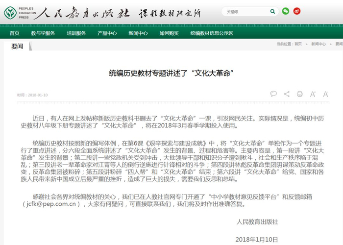 新版历史教科书"文化大革命"一课被删?官方这样回应