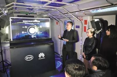 1月10日,比亚迪公司负责人在全自动无人驾驶“云轨”列车发布现场体验人脸识别启动列车。