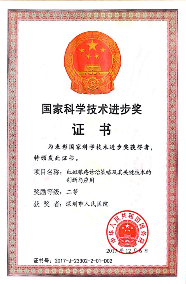 中南大学湘雅二医院陆前进团队与深圳市人民医院临床医学研究中心戴勇团队联合完成的“红斑狼疮诊治新技术的建立与推广应用”项目,获得国家科技进步二等奖,并荣获2017年中国十大医学进展。这是继脊柱外科代成甫主任医师获2001年国家科技进步奖二等奖之后,深医再度荣获国家级大奖。