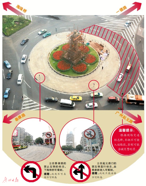现场交通标识显示,有1/4的海珠广场环岛不能驶入,建议交通部门完善标志。