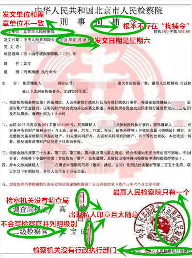 让我们先来看看,骗了女博士85万的“刑事拘捕令”到底有多假!请注意下图中绿色圈出的各部分及对应的红字注释。