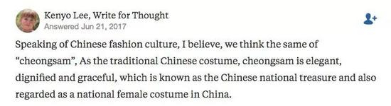 在Quora上有外国网友问“什么才代表中国的时尚”,收到最多赞的回答就是“旗袍”。这位网友表示,旗袍自带优雅迷人的光芒,穿着旗袍的中国女性更是美到让人很难移开目光。还有外国网友在Quora上发求助帖,“怎样才能买到最正宗的中国旗袍呢,我不怕贵”。很多网友则是对穿着旗袍的场合颇感兴趣,慢慢都是被“种草”的画风。