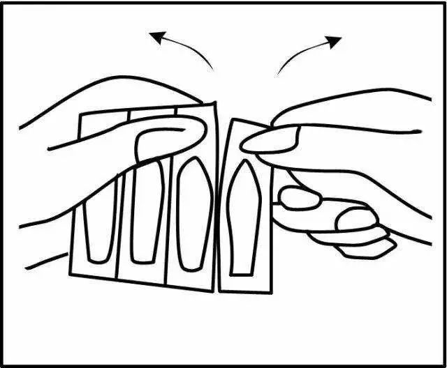 ● 从开启口处将前、后塑片分开,然后撕开,使二塑片分离,取塑料指套一只,套在食指上。
