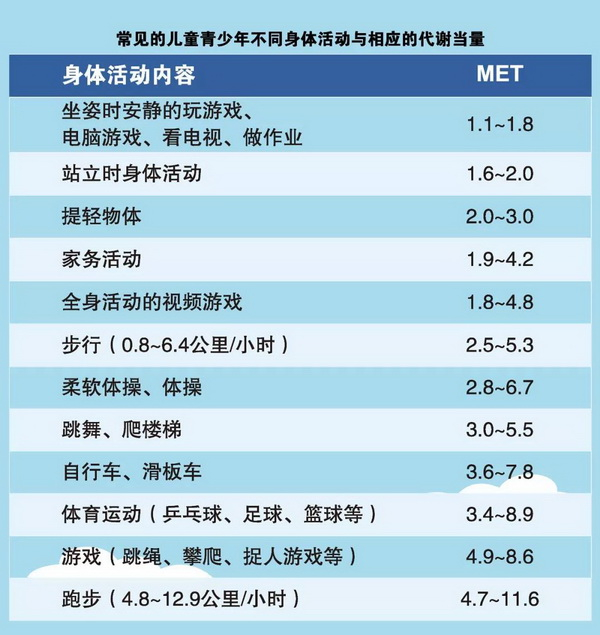 《中国儿童青少年身体活动指南》。MET为身体活动强度代谢当量的基本测量单位,1MET为安静坐位休息时的能量消耗率。本文图片均来自 上海儿童医学中心
