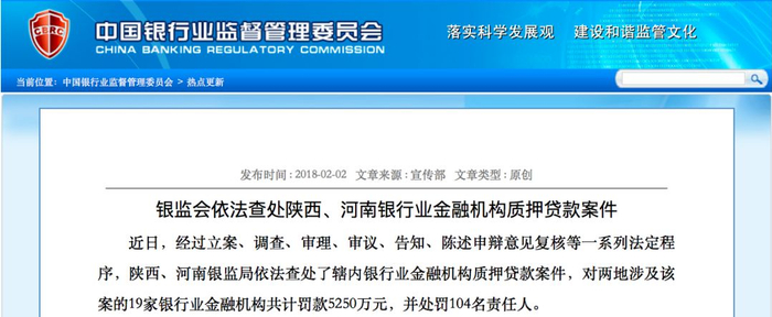 2月2日,银监会通告称,陕西、河南两地银监局在排查过程中发现,多名外部不法人员横跨两省,以纯度不足的非标准黄金做质押物,骗取19家银行业金融机构190亿元贷款。