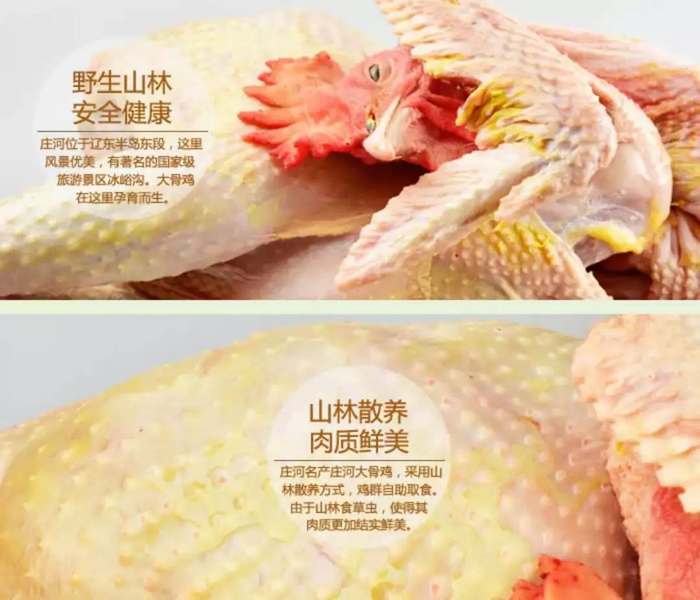 “庄河大骨鸡”又名“庄河鸡”,是我国著名的肉蛋兼用型地方良种,主产于大连庄河市境内。属于北方鸡种,肉质较南方鸡种紧致且多汁。具有耐精饲,生长周期长的特点。