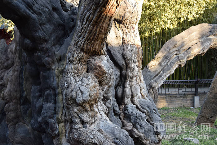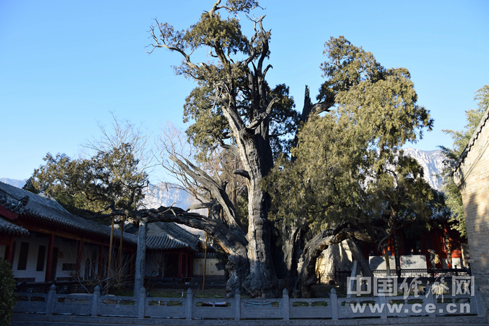 “大将军柏”树身向南斜卧在“凸”字墙上。树冠浓密宽厚,郁郁郁葱葱,尤如一柄大伞遮掩晴空。?