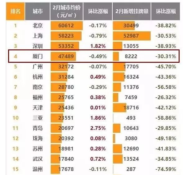 其中厦门二手房成交均价47489元/㎡,环跌0.49%,居全国第四;二手房新增挂牌量8222,环跌30.31%。
