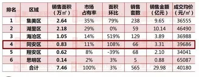 可以看到,集美区销售金额最高,而同安区却在岛外四区中,拿到最高成交均价3.9万元/㎡!妥妥的房价大逆袭!