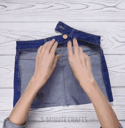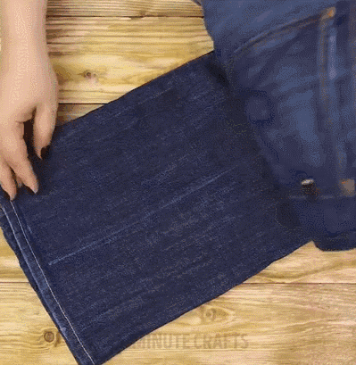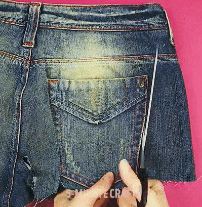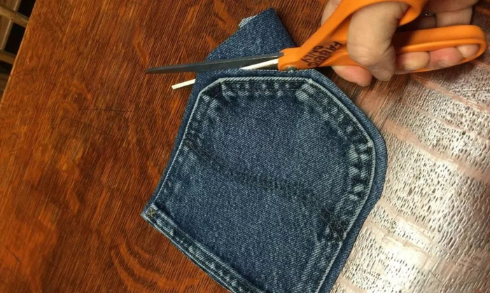 把牛仔裤沿着腰围部分剪一剪,留下一口袋部分,一个简单的工具包就做好了,还不需要缝线。