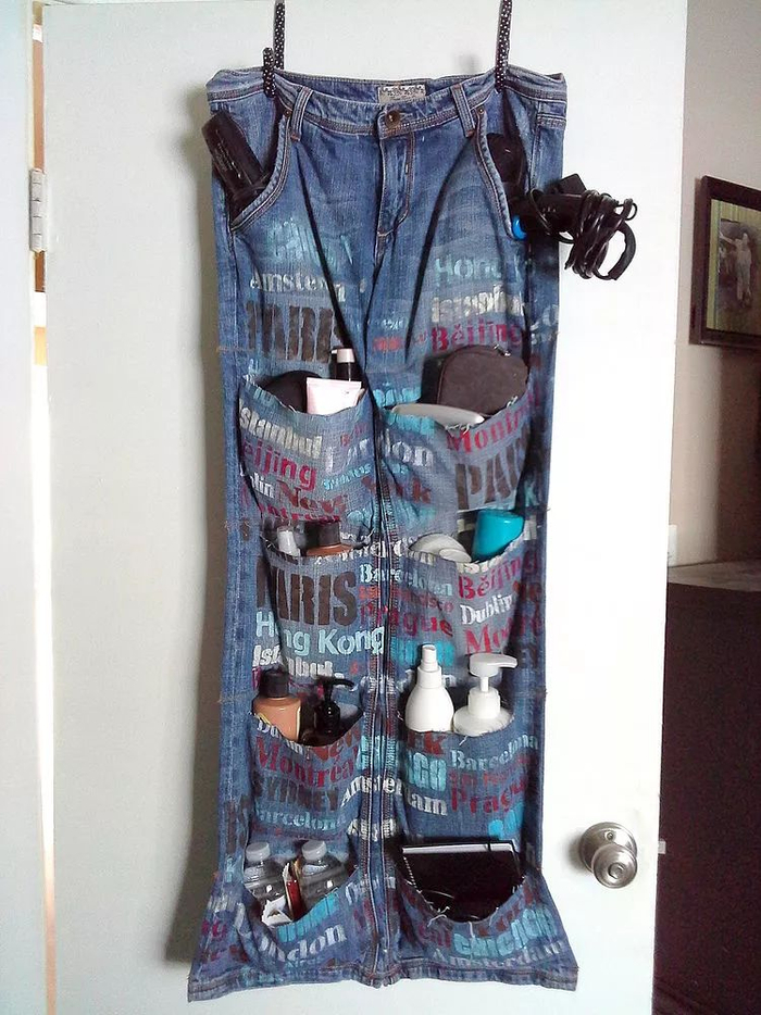 牛仔裤做成收纳袋,美到想不到!市面上的收纳袋都大同小异,基本上就那么几个款式。但是牛仔裤改造成收纳袋就不一样了,能够按照你的想法制作牛仔收纳袋,在裤腿上量出合适的大小,然后将布料裁剪下来。