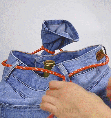 将绳子穿过牛仔裤的裤腰,再将两个裤腿打结系紧。