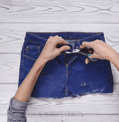 将牛仔裤前端的布料剪掉,只留下腰带部分。
