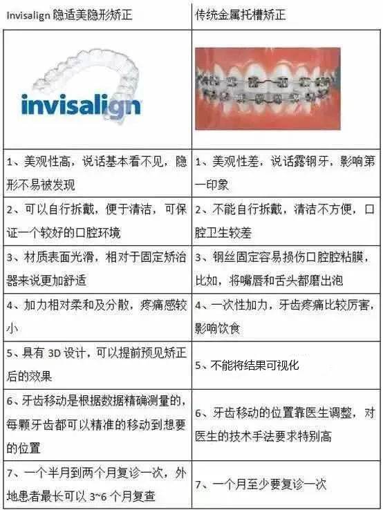 A:最大的好处自然是美观舒适喽!而且相比传统矫正方式,隐形矫正的复诊次数更少,过程中需要找医生急诊的问题也更少,不用跑来跑去看牙齿,矫牙so easy!看下图对比列项就一目了然了。