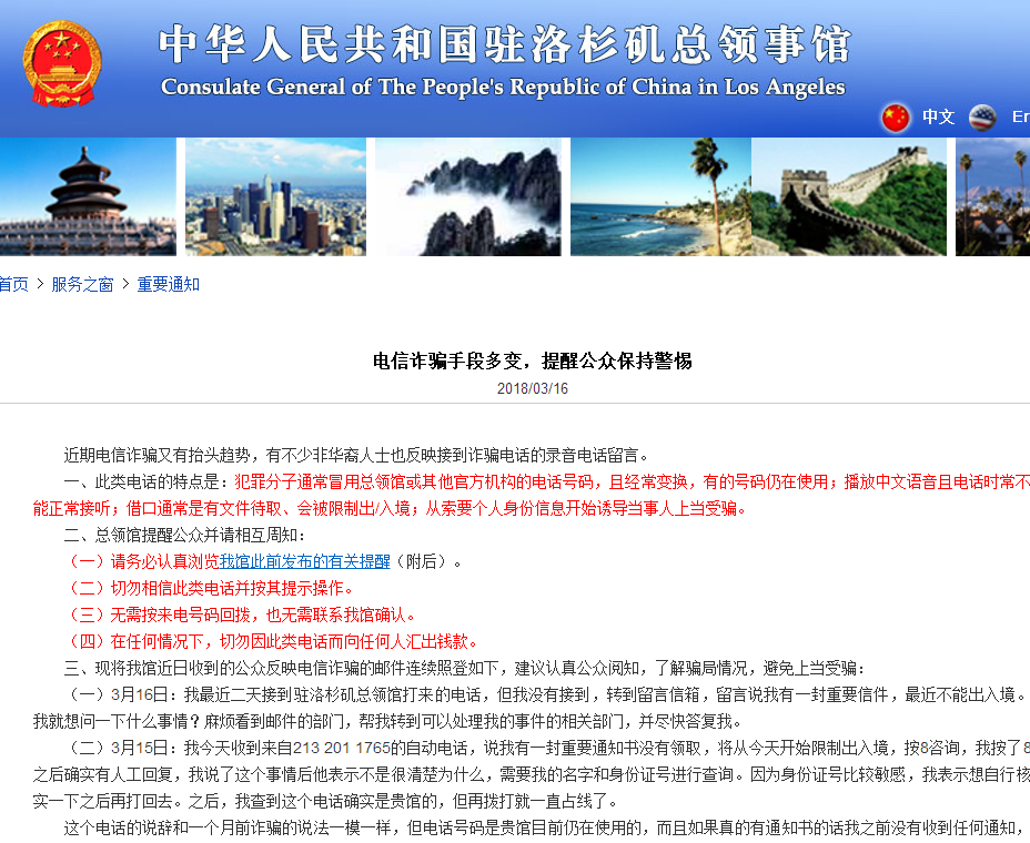 中新网3月20日电 据中国驻美国洛杉矶总领馆网站消息,近期电信诈骗又有抬头趋势,有不少非华裔人士也反映接到诈骗电话的录音留言。此类电话的特点是:犯罪分子通常冒用总领馆或其他官方机构的电话号码,且经常变换,有的号码仍在使用;播放中文语音且电话时常不能正常接听;借口通常是有文件待取、会被限制出/入境;从索要个人身份信息开始诱导当事人上当受骗。