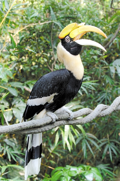 双角犀鸟,中国仅分布于云南南部西双版纳傣族自治州,野生环境下胆小怕人,难得一见,可谓珍禽。在中国数量稀少,被列入国家重点保护野生动物名录。由于繁育难度大,广州在去年才成功繁育一只,标志着广州的珍稀鸟类繁育技术跨上了一个新台阶。