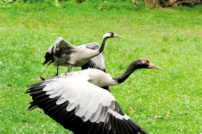 广州现已成功繁殖出中国一级保护动物丹顶鹤68只。丹顶鹤繁殖期一般是4至6月,一雌一雄制。在长隆飞鸟乐园,3月末4月初,当丹顶鹤到达繁殖地后不久,即开始配对和占领巢域,雌雄鸟彼此通过在巢域内的不断鸣叫来宣布对领域的占有。“求偶时也伴随着鸣叫,而且常常是雌雄鸟彼此对鸣、跳跃和舞蹈。”饲养员说,丹顶鹤鸣叫时昂头、仰脖,嘴尖直朝天空,三级飞羽蓬起,且随叫声抖动。
