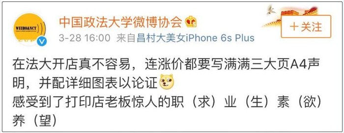 “网红”涨价声明是否能获得学生认可?有法大学生表示,身在政法院校,天然具有强烈的维权意识和法律意识,在这样的校风下,打印店会做出这样别出心裁却又公开、透明、平易近人的涨价声明也不奇怪,这恰恰证明这是一家良心店,可谓勤勤恳恳、光明正大。