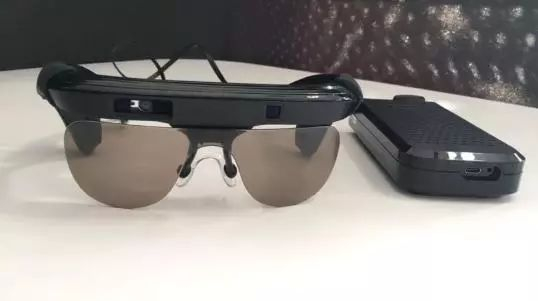 粗看之下,它和谷歌眼镜的造型有些相似,镜片上方镜架包含了微型摄像头。一根数据线连接着烟盒大小的主机,摄像头拍摄到的信息会传送到这里进行处理。