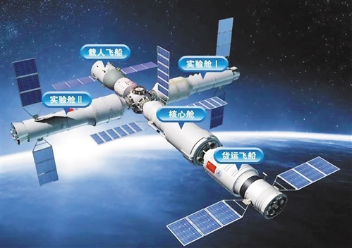 天宫一号完美落幕,而在几天之前,中国新一代空间站的核心舱已对外首次公开,预计将在二0二0年前后发射升空,之后再经过几十次的发射组装,中国就将迎来属于自己的“空间站时代”。图为建成后的天宫空间站。 (概念图)