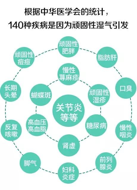 顽固性湿气的人,可能体内的湿气已经诱发某几种疾病,比如顽固性肥胖,脂肪肝,口臭,慢性咽炎,前列腺炎,顽固性湿疹,慢性荨麻疹,关节炎,妇科炎症,脚气,反复咳嗽,头晕失眠,痘痘,蝴蝶斑,高血压高血脂,肾虚,糖尿病等等。