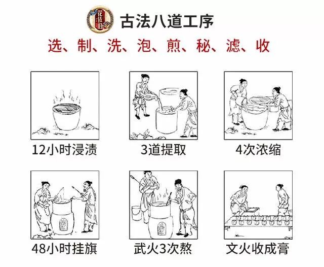 按照上策膏的配方,将20味药材精确配比,采用八道工序,7天熬制成功。12小时侵泡,3道提取,4次浓缩,48小时化胶,武火三次熬煮,文火收膏。最终100公斤的药材可以到13公斤的膏滋,就像这样: