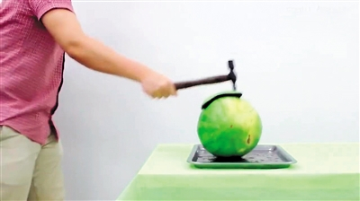 在测试视频中,一块巴掌大小的长方形凝胶材料向人们展示着强大的防护功能:把它套在手上,用手随便击打桌子锐角而无痛感;把它垫在西瓜上,用锤子无法击碎西瓜(见右上小图);把它垫在气球上,用箭也射不穿气球。这种凝胶材料,就是新型防护材料Armourgel。