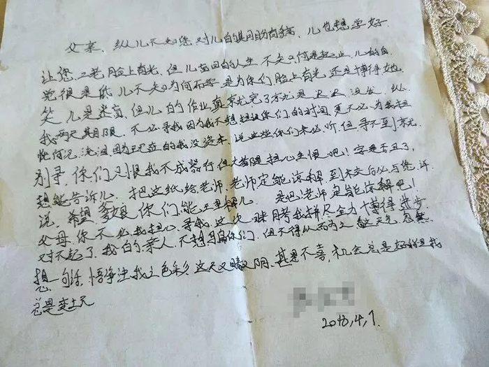 信中写到:“父亲,纵儿不知您对儿的期盼有多高,儿也想学好让您二老脸上有光,但儿盲目的人生不知何时起止,儿的自觉很是低,儿不知为何而学,是为你们脸上有光还是博得他人笑,儿是迷茫,但儿的作业真就(做)完了,就是迟迟没发,给我两天期限,不必寻我,因为我不想耽误你们的时间,更不必为我担忧流泪。因为现在的我没资本,说这些话你们未必听,寻不到就不要寻,你们只恨我不成器但大都是担心生恨吧!字是否丑了。把这纸给老师,老师定能谅解,到校后必与您详说。希望爹娘你们能理解儿。是吧! 定能谅解吧!父母你不必担心寻我。这次回来月考我拼尽全力博得进步。对不起了,我的亲人,不想骗你们。但不得已而为之……”