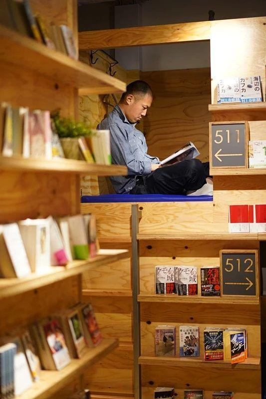 在这里,人们可以边看书边享受咖啡和美食,累的时候可以在公共区域的人造草坪和鲜花中漫步,透过落地飘窗欣赏新宿的街景;如果想要独处的时光,可以在嵌入书架里的床铺上看书和休息。