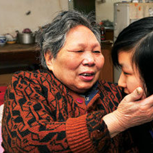 已经双目失明的黄桂英(左)看不清袁杰的长相了,抚摸袁杰的脸看她是否又瘦了