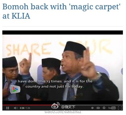 马来巫师带“魔毯”欲第二次做法。马来西亚星报报道,当地著名巫师易卜拉欣昨天再次来到吉隆坡国际机场作法。这次他带来了两个椰子、一张“魔毯”、一根“魔法”拐杖等。易卜拉欣强调称本次作法是出于自我意愿,并称目的是驱散恶灵,如果飞机确实坠毁了,能帮助救援人员找到客机。