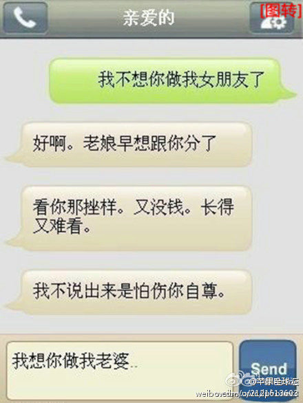 男友:“在我心里,你就像个大大的苹果。”女:“讨厌,是说我脸儿红又圆吗?”男:“我是说,我要削你。”