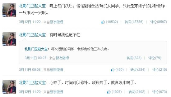在全世界追捧都敏俊、李敏镐两位帅哥时,微博名为@北影门卫赵大宝 的本土萌叔横空出世迅速走红。原因是这位门卫师傅“晚上锁门以后,偷偷翻墙出去玩的女同学,只要是穿裙子的我都会睁一只眼闭一只眼。”