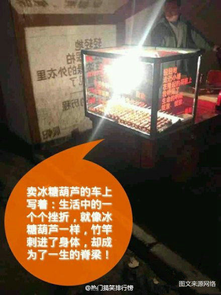 卖冰糖葫芦的车上写着:生活中的一个个挫折,就像冰糖葫芦一样,竹竿刺进了身体,却成为了一生的脊梁!