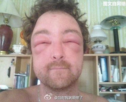 美国一哥们被蜜蜂蛰过之后。。。都这样了还有勇气自拍。。。实在是难能可贵啊!