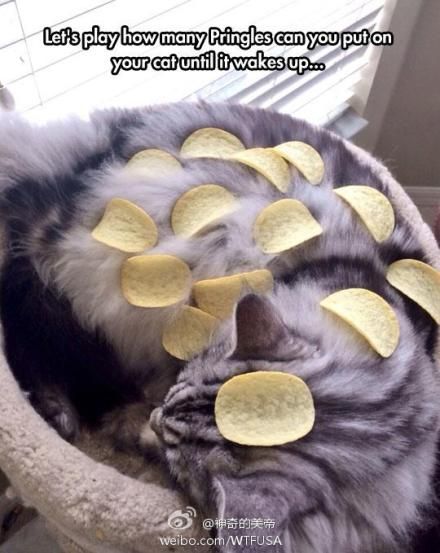 丧心病狂的玩法:在猫睡着的时候,往猫身上放薯片,看能放多少片才会醒。。。