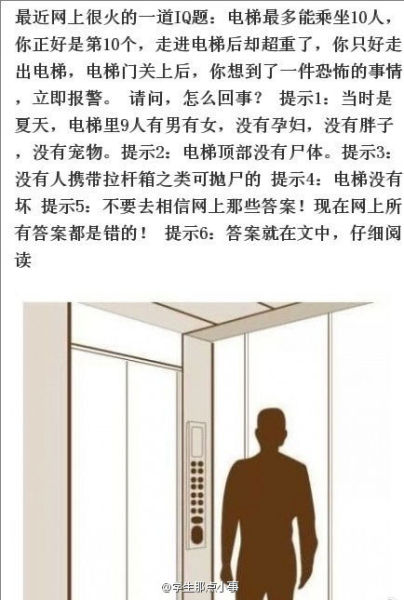 最近网上很火的一道IQ题:电梯最多能乘坐10人,你正好是第10个,走进电梯后却超重了,你只好走出电梯,电梯门关上后,你想到了一件恐怖的事情,立即报警。请问,怎么回事?提示1:当时是夏天,电梯里9人有男有女,没有孕妇,没有胖子,没有宠物。提示2:电梯顶部没有尸体。提示3:没有人携带拉杆..…