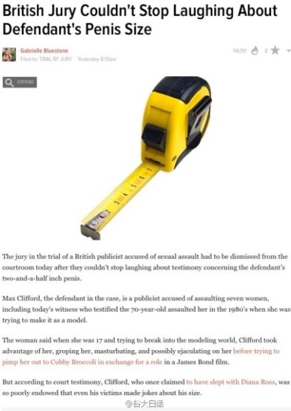 原告说“Max的丁日坚挺时仅有6厘米。她之前从未近距离见过丁日,还以为他那算挺大的,因为她的嘴很小”。陪审团听完笑个不停,法官不得不休庭几分钟让大家笑个够…(via. 谷大白话)