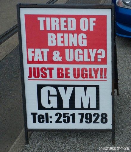 好贱的广告。。。。“又丑又胖?表紧,来我们健身房吧,这样你就只剩下丑了。。”