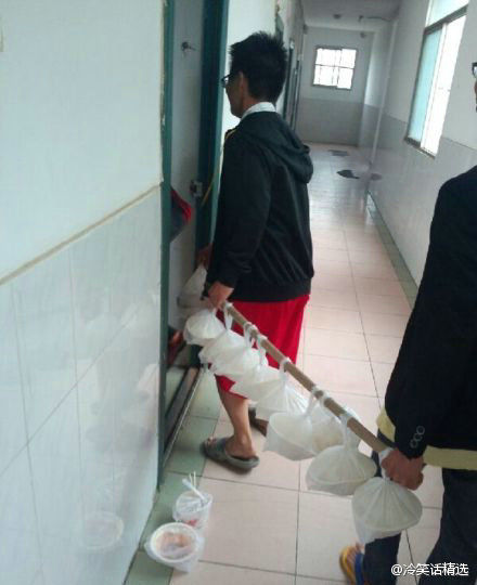 中国好室友——带饭哥 :木棍上有9份外卖,手上还拎着1份走向寝室,真不愧为中国最佳室友。童鞋们,还记得那些年给我们带饭的室友么?